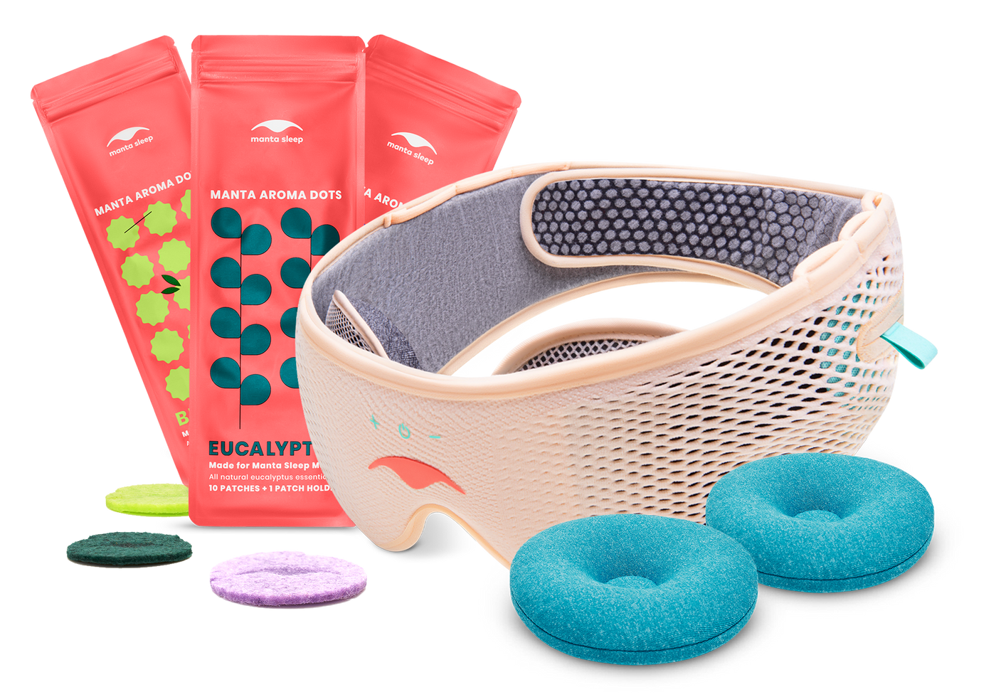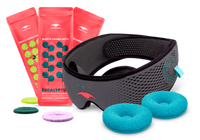 The NEW SOUND Mask not only blocks light but also helps you sleep to the sounds that relax you. COOL Eye Cups soothe your eyes and sinuses, while AROMA Dots offer calming aromatherapy.